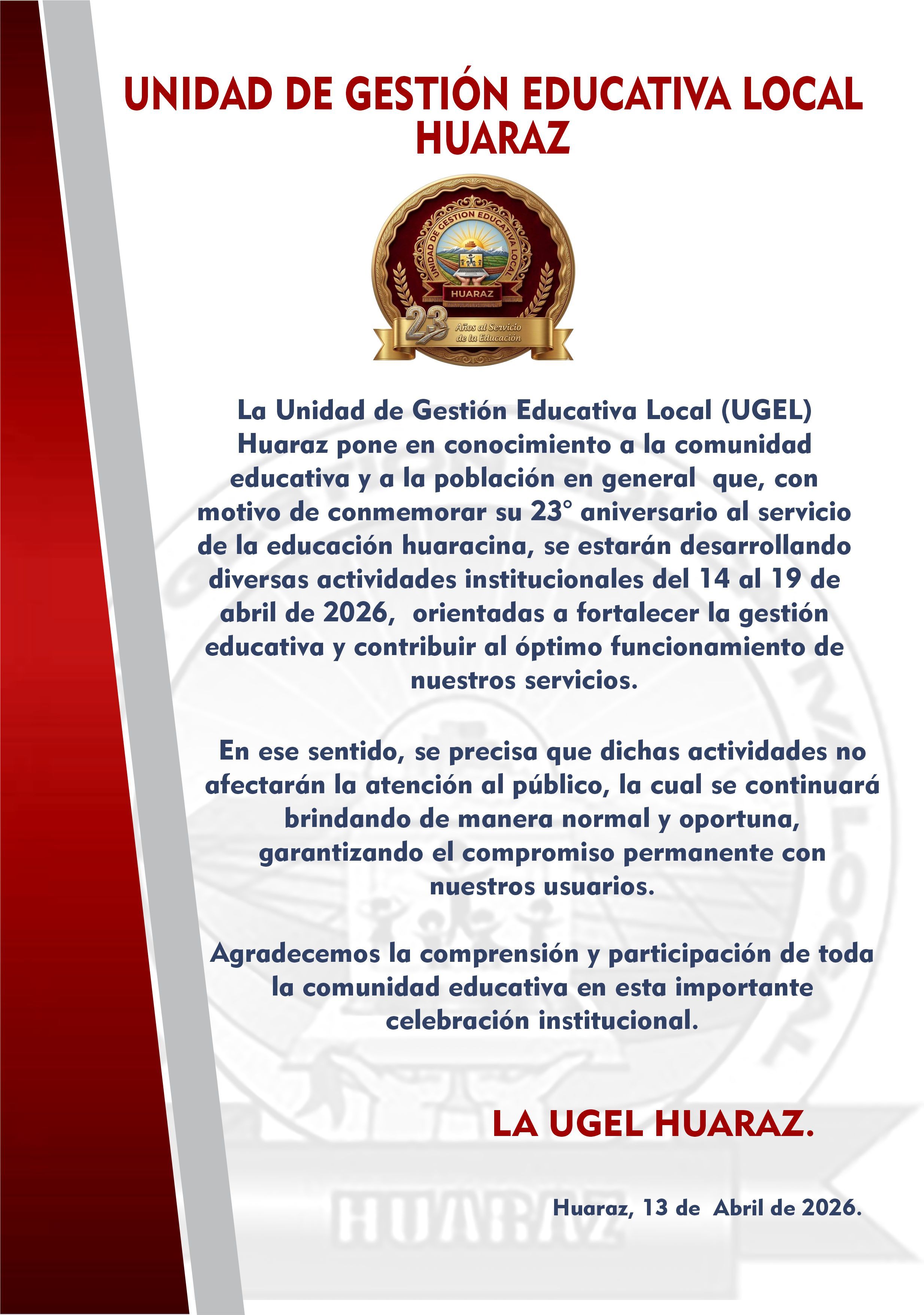 #UGELHuaraz  23° Aniversario  La Unidad de Gestión Educativa Local de Huaraz saluda con especial reconocimiento a todos los trabajadores por su valioso compromiso y dedicación al servicio de la educación, en el marco de su 23° aniversario institucional. Destacamos el esfuerzo conjunto que dí...